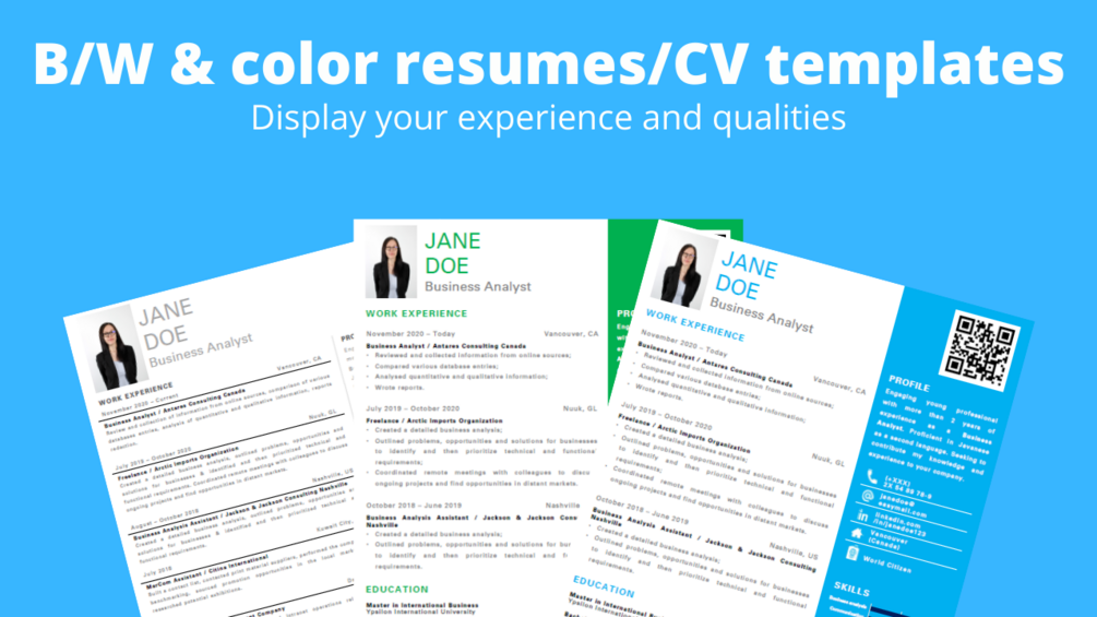 1 B/W resume/CV template; 1 color resume/CV template; 1 cover letter template; 1 recommendation letter template; 1 application list file